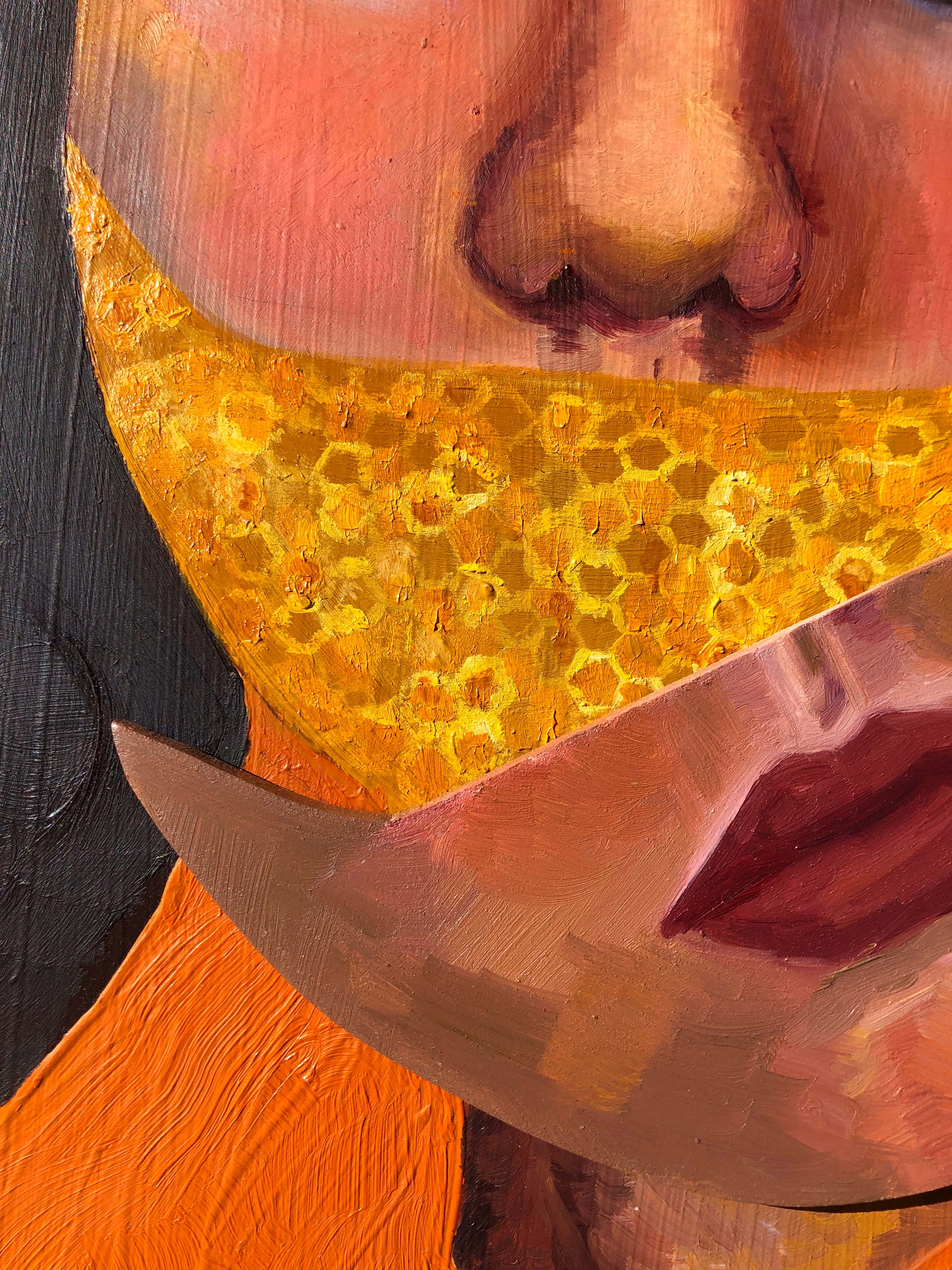 resting bee face – oil on wood with moveable jaw piece, with paper bee #1